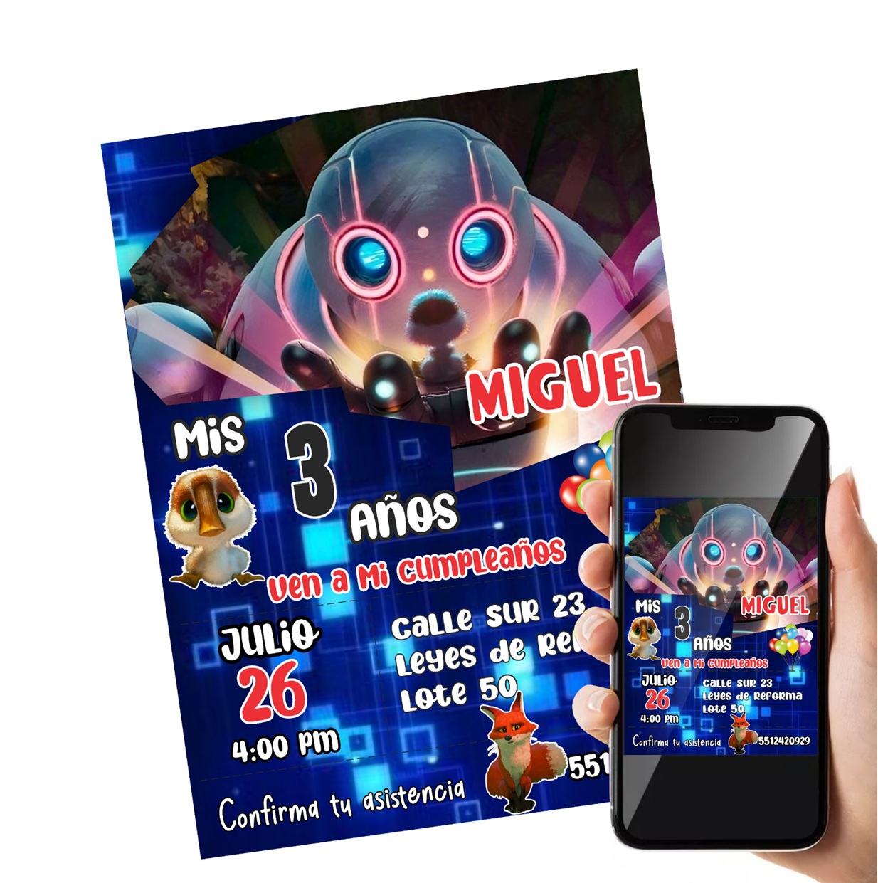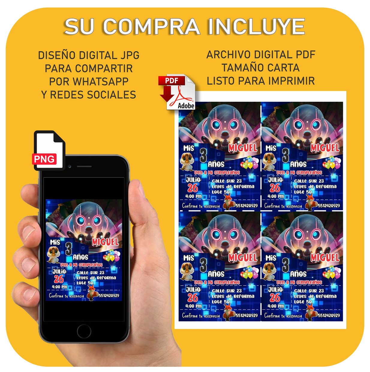 Con un diseño inspirado en tus personajes favoritos, Podrás Descarga e imprime donde quieras, sorprender a tus invitados con un diseño único y original que capturará la esencia de tu Fiesta. El formato digital de esta invitación te permitirá enviarla de manera rápida y sencilla a todos tus invitados a través de correo electrónico o redes sociales. No tendrás que preocuparte por los tiempos de envío o los costos adicionales.
